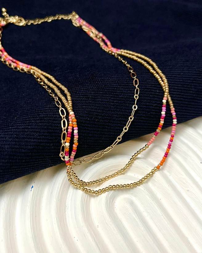 گردنبندچندلایه وارداتی اروپا روکش طلا با مهره های دست ساز سرخابی .ساخته شده با بهترین آلیاژ و مقاوم در برابر آب و کاملا رنگ ثابت و ضد حساسیت میباشد.
